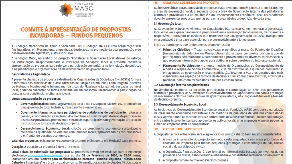 A prestação de serviços para aumentar a participação da comunidade na elaboração de políticas e na gestão orçamental do governo local é uma iniciativa importante para Moçambique. Este processo visa garantir que as vozes e necessidades da população sejam ouvidas e integradas nas decisões governamentais.